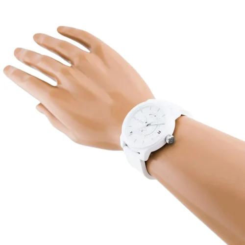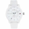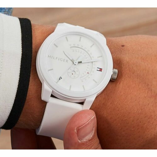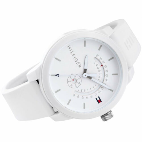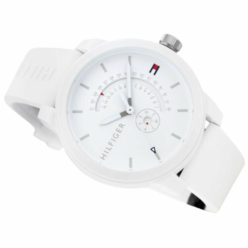 ساعة Tommy Hilfiger 1791481 للرجال، بتصميم عصري سبور من مجموعة Denim، بلون أبيض ناصع للمينا والسوار المصنوع من السيليكون (مطاط).