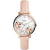 تصميم أنثوي راقٍ من مجموعة Jacqueline؛ ميناء أبيض طراز “زهرة” بقطر 36 مم، وسوار جلد وردي-خدودي يضفي لمسة ناعمة وعصرية.