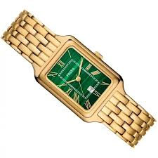 ساعة أنثوية فاخرة بميناء من حجر المالاكيت الأخضر، حركة كوارتز مع عرض التاريخ، وسوار من الفولاذ المقاوم للصدأ مطلي باللون الذهبي — تصميم مستطيل رفيع يعطي إطلالة راقية وعصرية