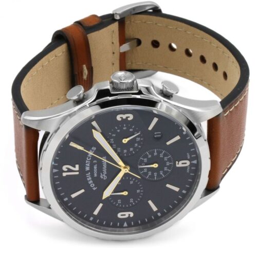 ساعة أنيقة بحزام جلد بني وميناء أزرق بقطر 46 مم تقريباً، حركة كوارتز مع وظائف كرونوغراف، ومقاومة ماء حتى 5 ATM.