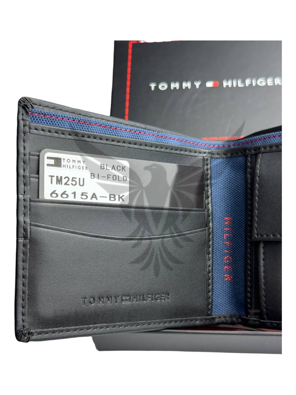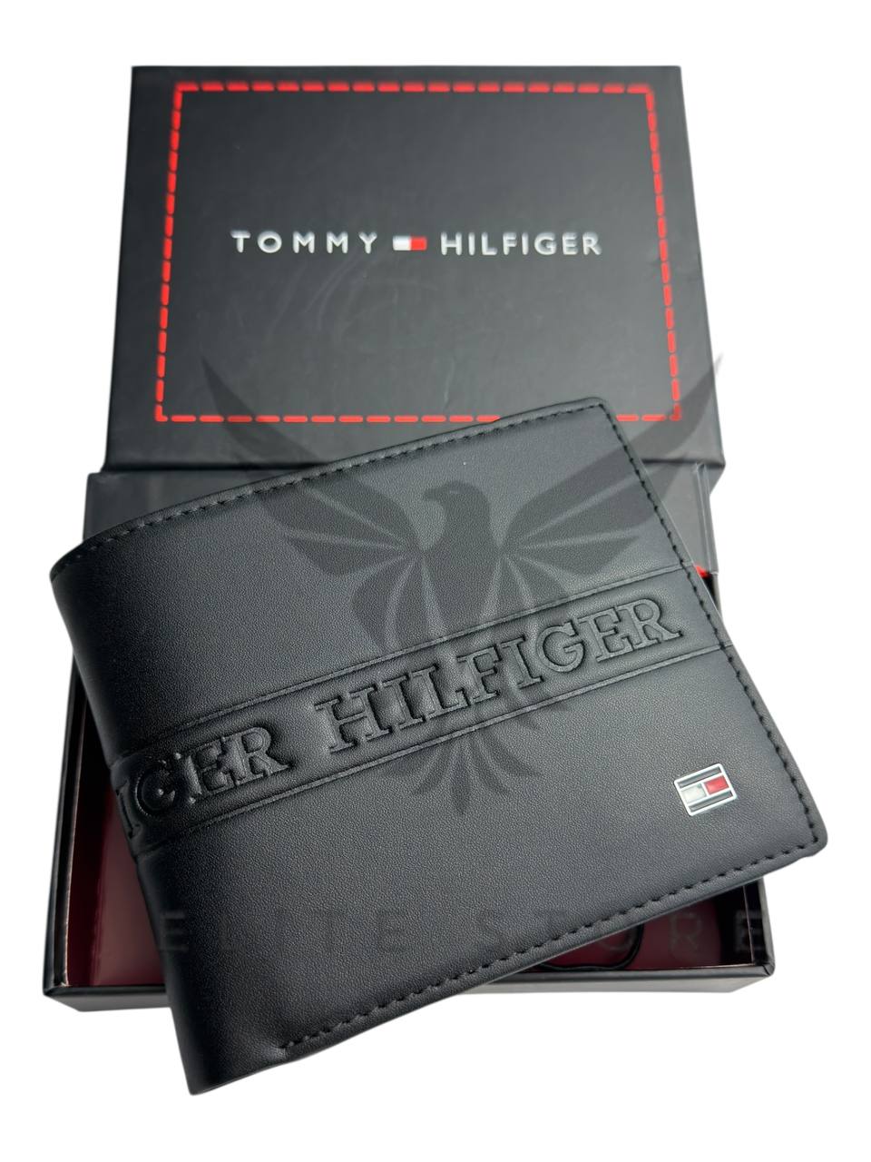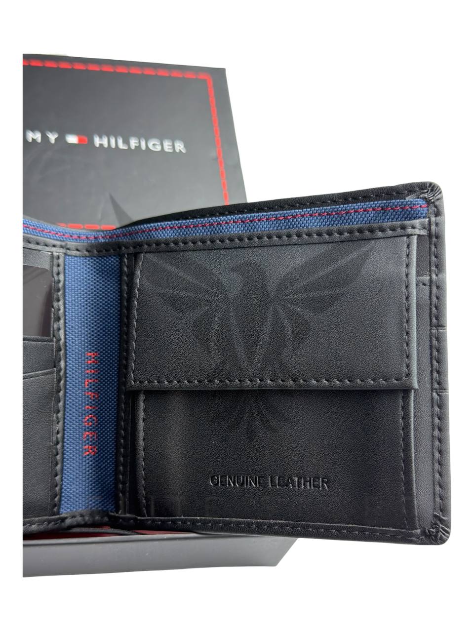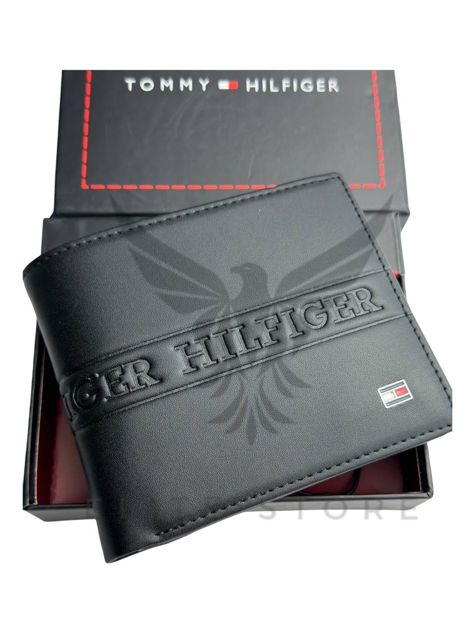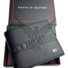 محفظة رجالي باللون الأسود مع خط مكتوب عليه تومي يديها طابع مميز ويبرز هوية البراند بشكل أنيق.
