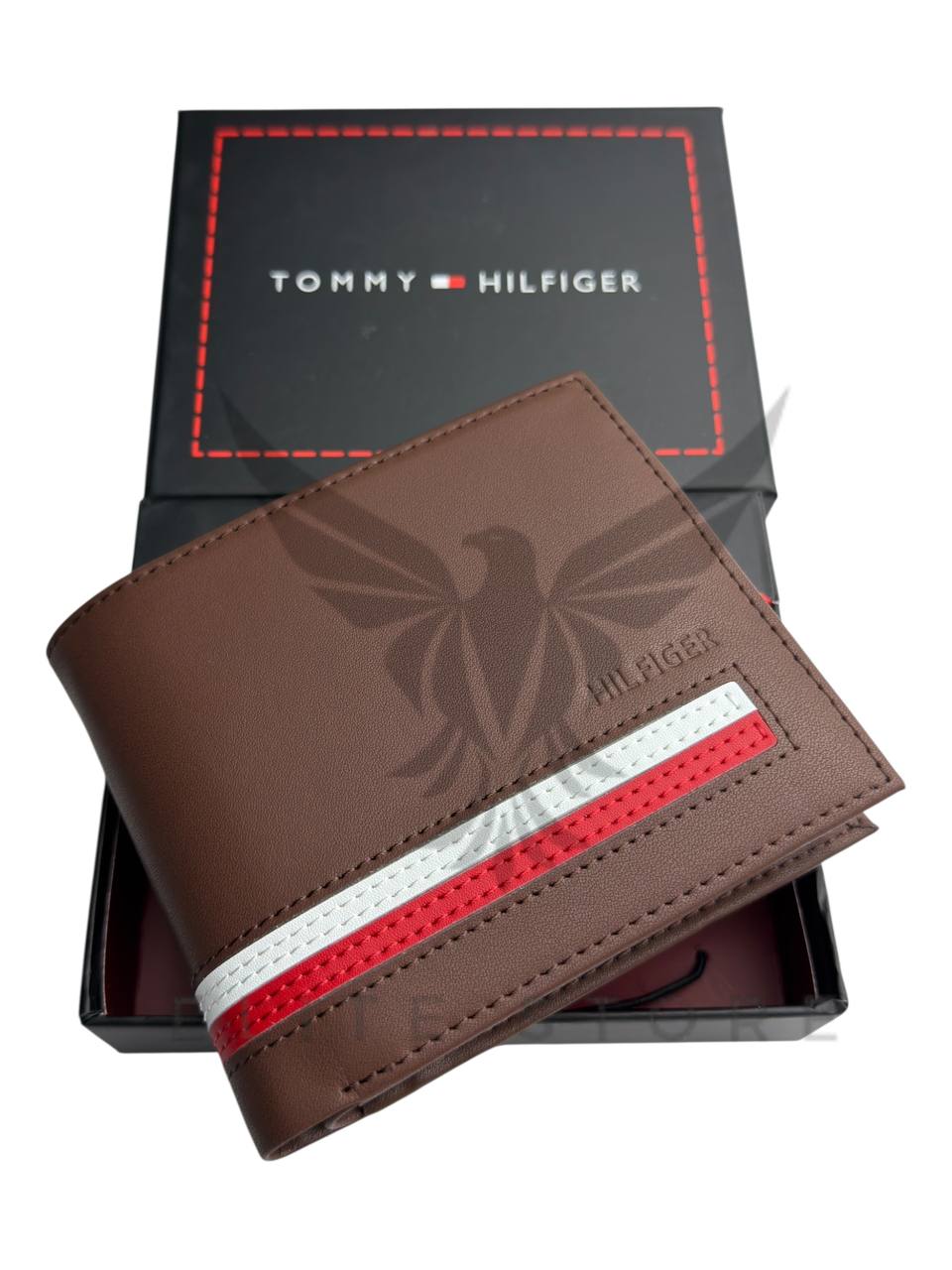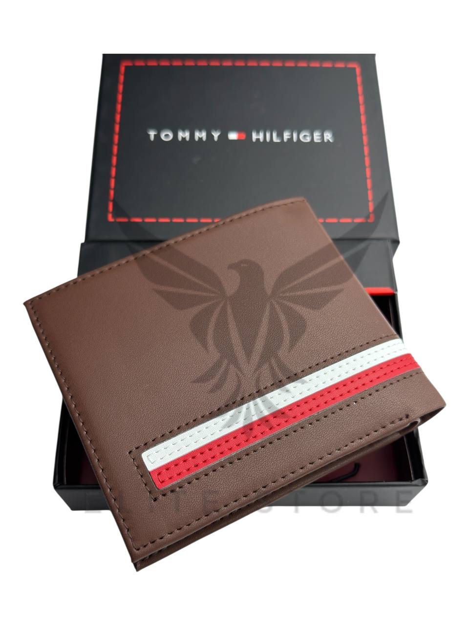 محفظة رجالي باللون البني مع خط أحمر وأبيض يديها لمسة كلاسيكية شبابية وفخامة واضحة.تصميم عملي وخفيف يناسب الاستخدام اليومي ويكمل أي ستايل رجالي بسهولة