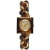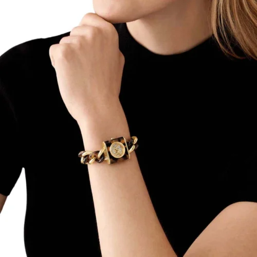 ساعة مايكل كورس “Chain Lock” موديل MK4808 بتصميم أنيق وعصري يجمع بين المعدن والراتنج على شكل سوار سلسلة سلمى. المينا ذهبي مرصّع بكريستالات صغيرة وإطار من الراتنج البني، يمنحها مظهر فخم ومميز. قطر العلبة حوالي 25 مم وتعمل بحركة كوارتز، كما أنها مقاومة للماء حتى 5 ATM.
