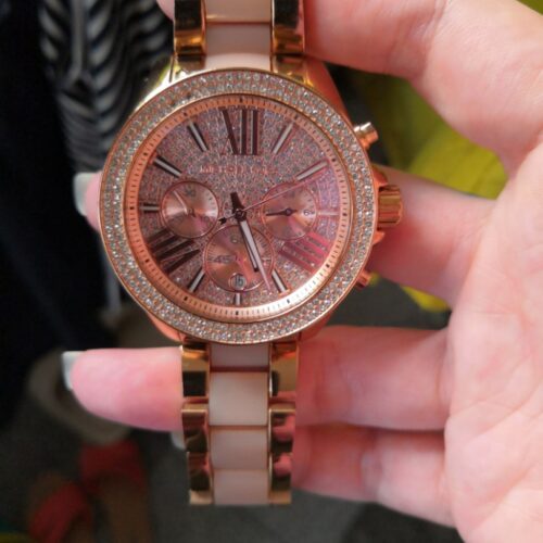 ساعة مايكل كورس موديل Wren MK6096 بتصميم أنثوي راقٍ من اللون الروز جولد، مع مينا مرصّع بالكريستالات (pavé) لإطلالة براقة وفاخرة. العلبة مصنوعة من ستانلس ستيل مطلي روز جولد، مع وصلات أسيتات مركزية تضيف لمسة عصرية ناعمة. قطر العلبة حوالي 42 مم، وتعمل بحركة كوارتز دقيقة. مقاومة الماء تصل إلى 5 ATM.