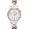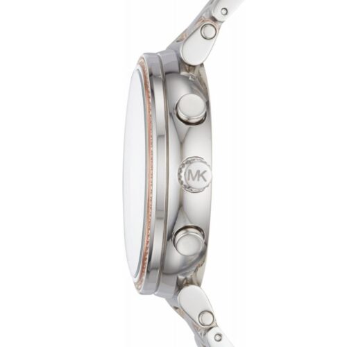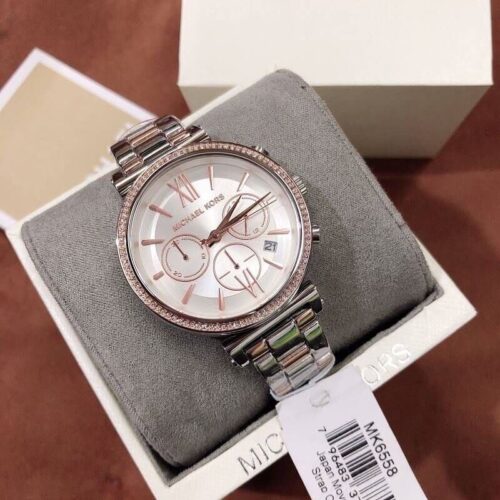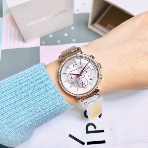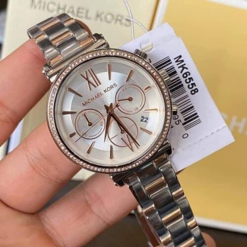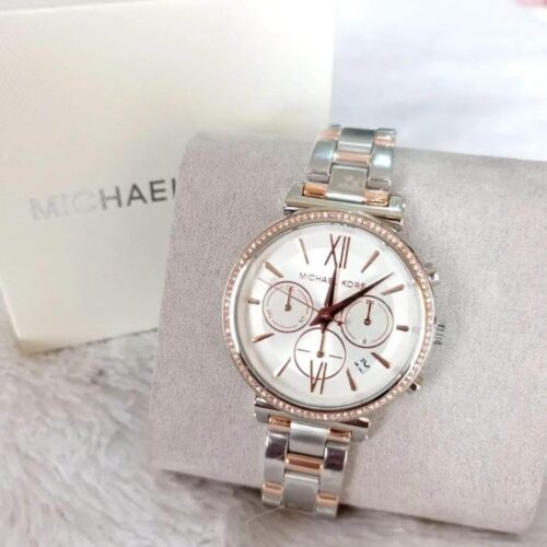 ساعة مايكل كورس Sofie MK6558 بتصميم أنثوي أنيق جدًا من الستانلس ستيل ثنائي اللون (فضي وروز جولد)، مع كريستالات Pavé مرصعة حول الإطار لمنحها لمسة فاخرة. قطر العلبة 39 مم، وتعمل بحركة كوارتز كرونوغراف تتميز بدوالات لعرض الثواني والدورات و24‑ساعة، كما أن الساعة مقاومة ماء حتى 50 متر (5 ATM).