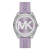 ساعة مايكل كورس Janelle MK7143 في تصميم عصري شبابي بلون أرجواني (ليلاف) مع سوار من السيليكون بنفس اللون لتوفير راحة وأناقة في الاستخدام اليومي. قطر العلبة 42 مم مصنوعة من ستانلس ستيل فضي، والمينا الأرجواني يحمل شعار “MK” كبير، وتعمل بحركة كوارتز. الساعة مقاومة للماء حتى 5 ATM (50 متر).