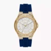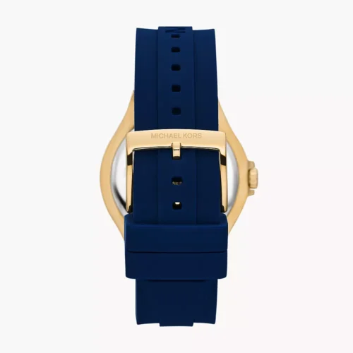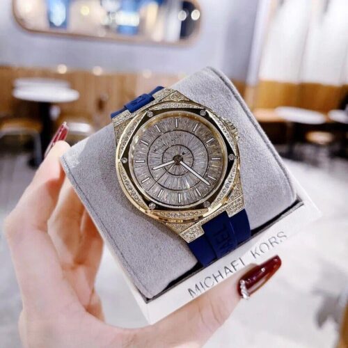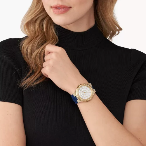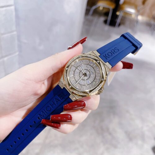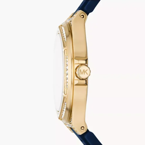 ساعة مايكل كورس Lennox / Camille MK7333 بتصميم فاخر ورياضي من الستانلس ستيل ذهبي مع حزام سيليكون أزرق يحمل شعار MK، ومينا مرصّع بالكامل بالكريستالات (pavé) مع أحجار باغيت لإطلالة متألقة. العلبة قطرها 43 مم، وتعمل بحركة كوارتز ثلاث‑عقارب.