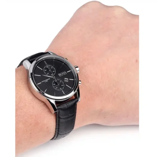 ساعة أنيقة من ماركة Hugo Boss، موديل 1513279، مصمّمة للرجال وتأتي بقرص مينا أسود أنيق وسوار جلد طبيعي باللون الأسود، بقطر حوالي 41 مم تقريباً ومقاومة للماء حتى حوالي 50 متر تقريباً. الساعة تأتي مع العلبة الأصلية، والشنطة الأصلية، والسيريال نمبر، والضمان — حزمة كاملة تضمن لك الأصالة والثقة.