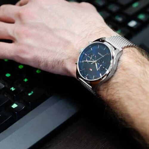 ساعة أنيقة من ماركة Tommy Hilfiger، موديل 1710420 (سلسلة Sawyer)، مصمّمة للرجال، وتأتي بعلبة من الستانلس ستيل المصقول بلون فضي وسوار معدني بنفس اللون، مع ميناء أزرق جذّاب. قطر العلبة حوالي 44 مم تقريبًا، وسمكها حوالي 11 مم. تتميّز بوجود وظيفة التوقيت الثنائي (Dual Time) وحركة كوارتز، ومقاومة للماء حتى حوالي 50 متر تقريبًا. الساعة تأتي مع العلبة الأصلية، والشنطة الأصلية، والسيريال نمبر، والضمان — باقة كاملة تضمن لك الأصالة والراحة.