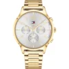 ساعة نسائية أنيقة من ماركة Tommy Hilfiger، موديل 1781872 (سلسلة Emmy). تأتي بعلبة من الفولاذ مطلية بلون ذهبي‑وردي، وقطر تقريباً 38 مم، وسمك حوالي 9 مم تقريباً. مقاومة المياه حتى حوالي 30 متر (3 ATM).