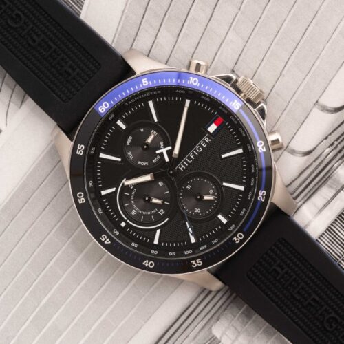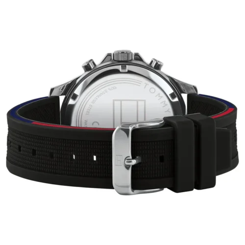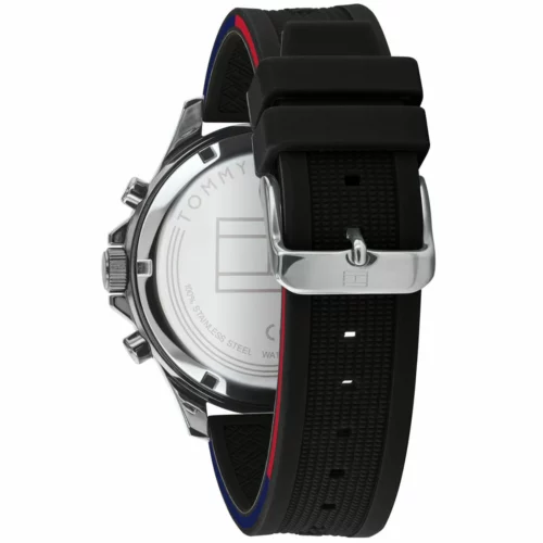 ساعة رجالية أنيقة من ماركة Tommy Hilfiger، موديل 1791724 (سلسلة Bank)، تأتي بقرص أسود أنيق وسوار سيليكون/مطاط باللون الأسود. يبلغ قطر العلبة حوالي 46 مم تقريباً، وسمكها حوالي 11 مم تقريباً. مقاومة الماء حتى حوالي 50 متر تقريباً.