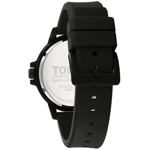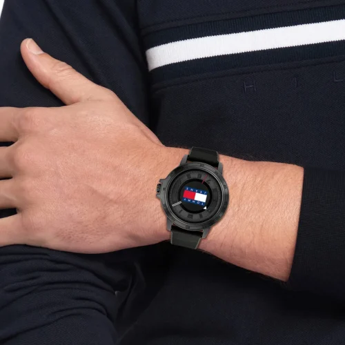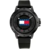 ساعة رجالية أنيقة من ماركة Tommy Hilfiger، موديل 1792032 (سلسلة “Houston”)، تأتي بقرص أسود أنيق وسوار سيليكون/مطاط باللون الأسود. قطر العلبة حوالي 44 مم تقريبًا، وسمكها حوالي 10.2 مم تقريبًا. الوزن المذكور حوالي 46 جرام. مقاومة الماء: تقريباً حتى 30 متر بحسب أحد المصادر.