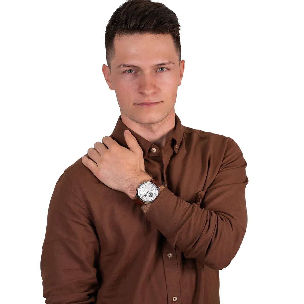 بلون فضي و استيك جلد طبيعي بلون بني